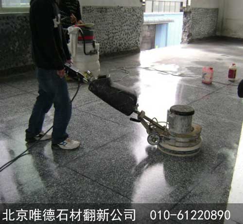 2、金屬磨片安裝在魔頭盤上,把翻新機調到500轉,開始打磨,把石材剪口研磨到平滑,然后在適中,禁止干磨,最后用吸水機吸干凈地面。