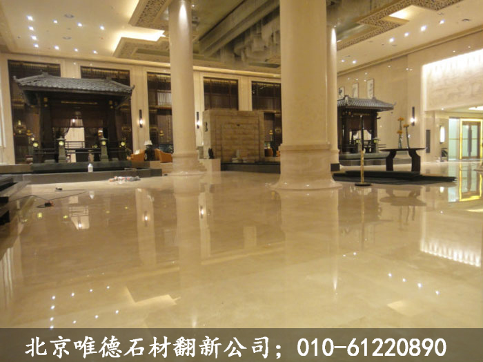 石材翻新石面晶硬處理,必須在平滑的石面才可以有理想的效果。根據石面磨損程度分為輕度翻新、淺度翻新、深度翻新等三種方式。其實從新石面使用開始就保持晶硬處理,石面可以一直保持完美狀態。即使門口或路中間人多的地方出現輕微磨損,也只須隔一段時間進行一次輕度翻新,而淺度翻新及深度翻新只是在日久失保養的石面使用。翻新機械如果進行輕度翻新,任何優質的低速地刷機均可,而淺度翻新及深度翻新則必須用專業加重機。配用工具百潔墊、玻璃刮、吸水機、“小心地滑”牌、石材翻新片、拋光粉等。